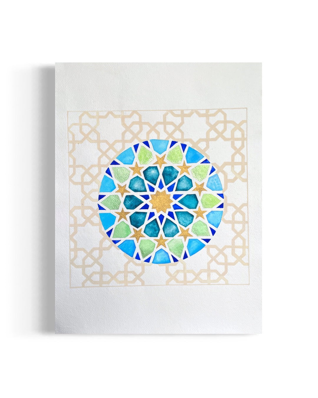 In the Front a pattern from the Ince Minareli Madrasa in Konya, Turkey is presented in various light blue and turquoise colors. This pattern is stating back to the 13th century.