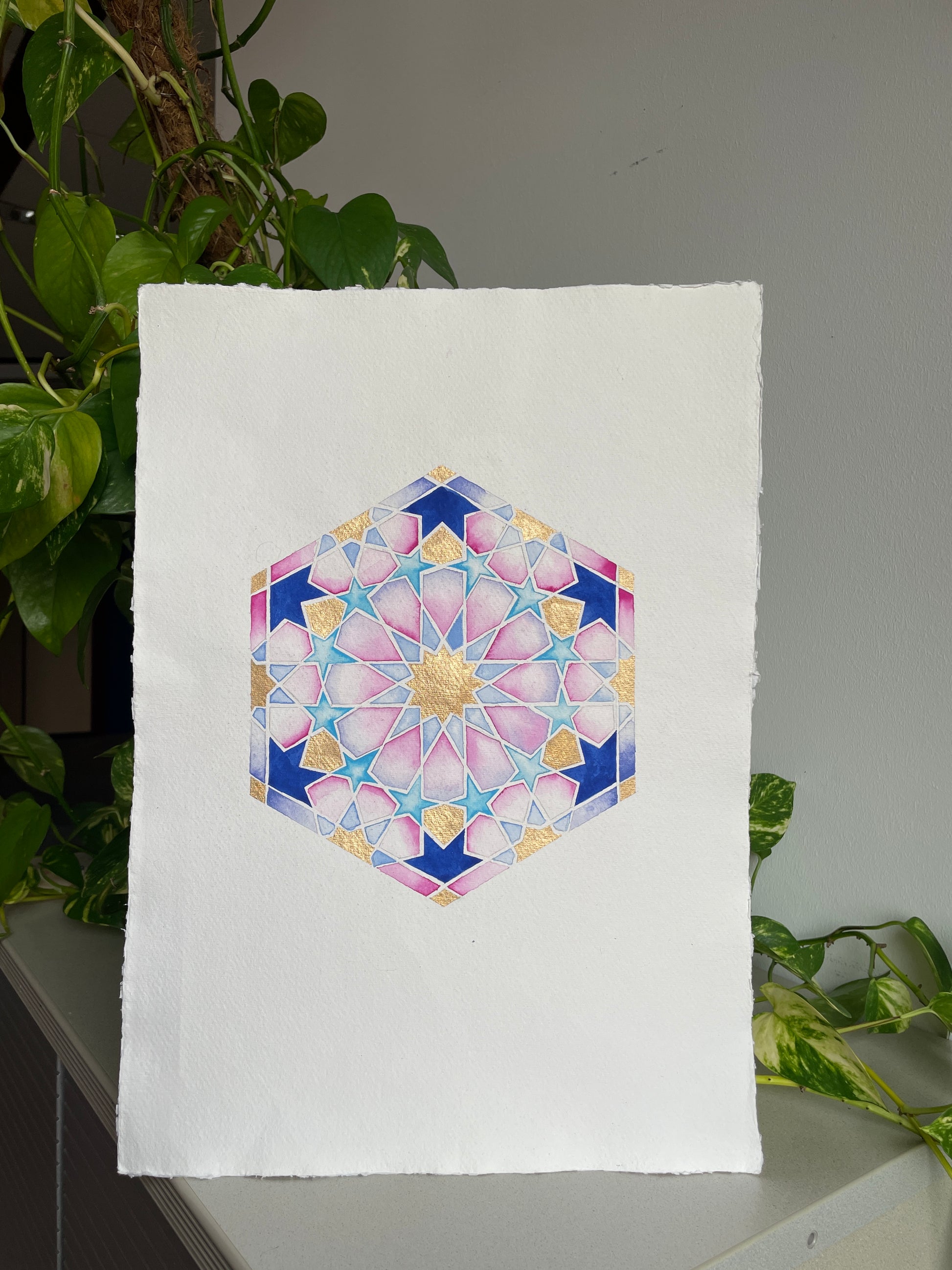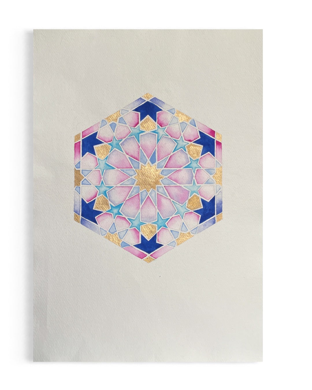 A beautiful geometric Design found in the beautiful country of Morocco. This beautiful 12-fold Rosette finds itself accompanied by blue, rose and gold colors making a unique blend.