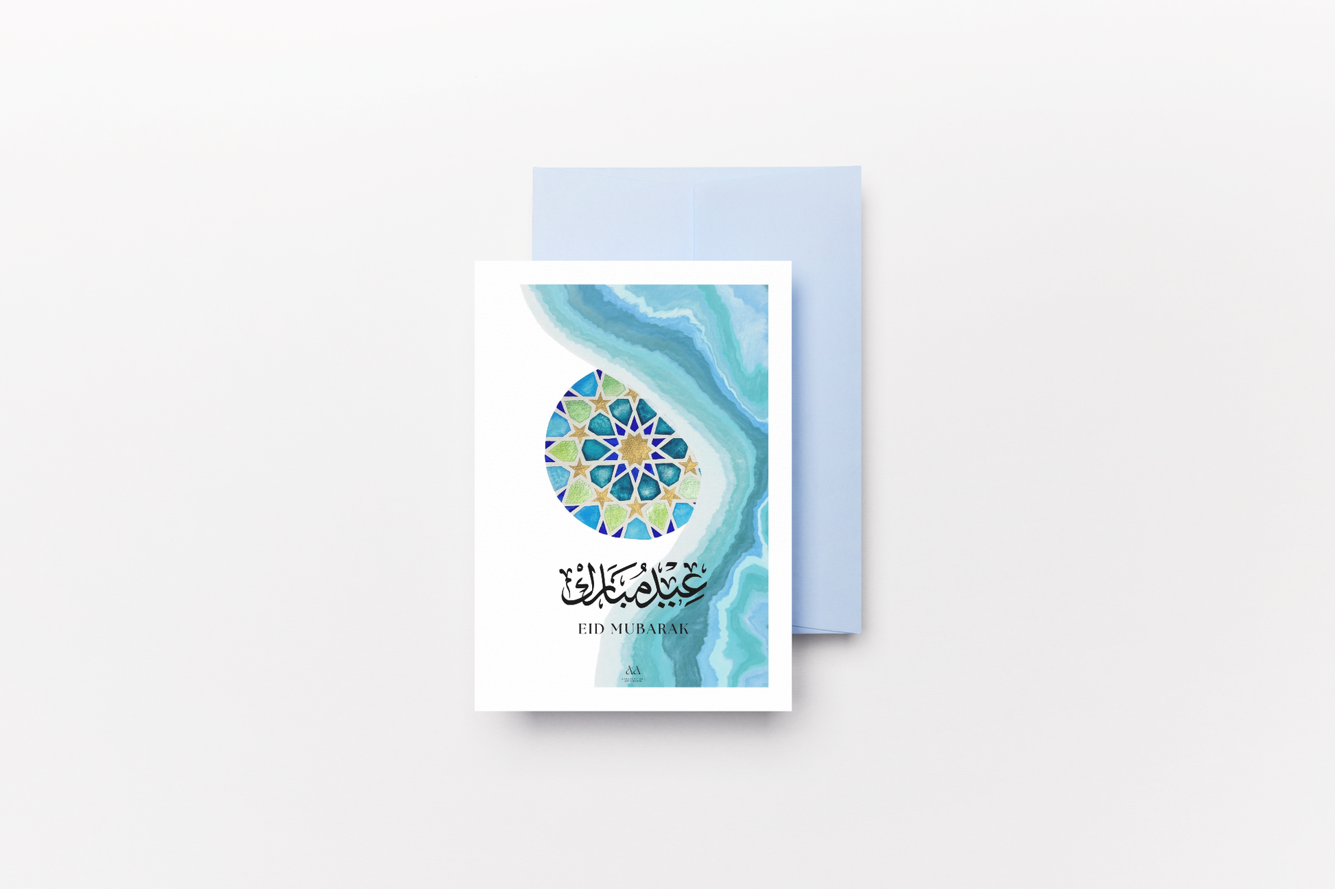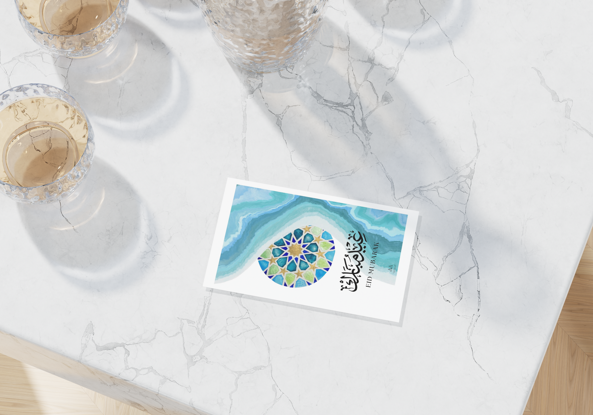 Überrasche deine Liebsten mit dieser einzigartigen Eid Mubarak-Grußkarte. Mit einem einzigartigen Design aus fließenden Farben und einem Muster der Heiligen Geometrie, zusammen mit dem arabischen Kalligraphie-Grußtext, ist diese Karte ein echter Hingucker und wird jeden Empfänger erfreuen!