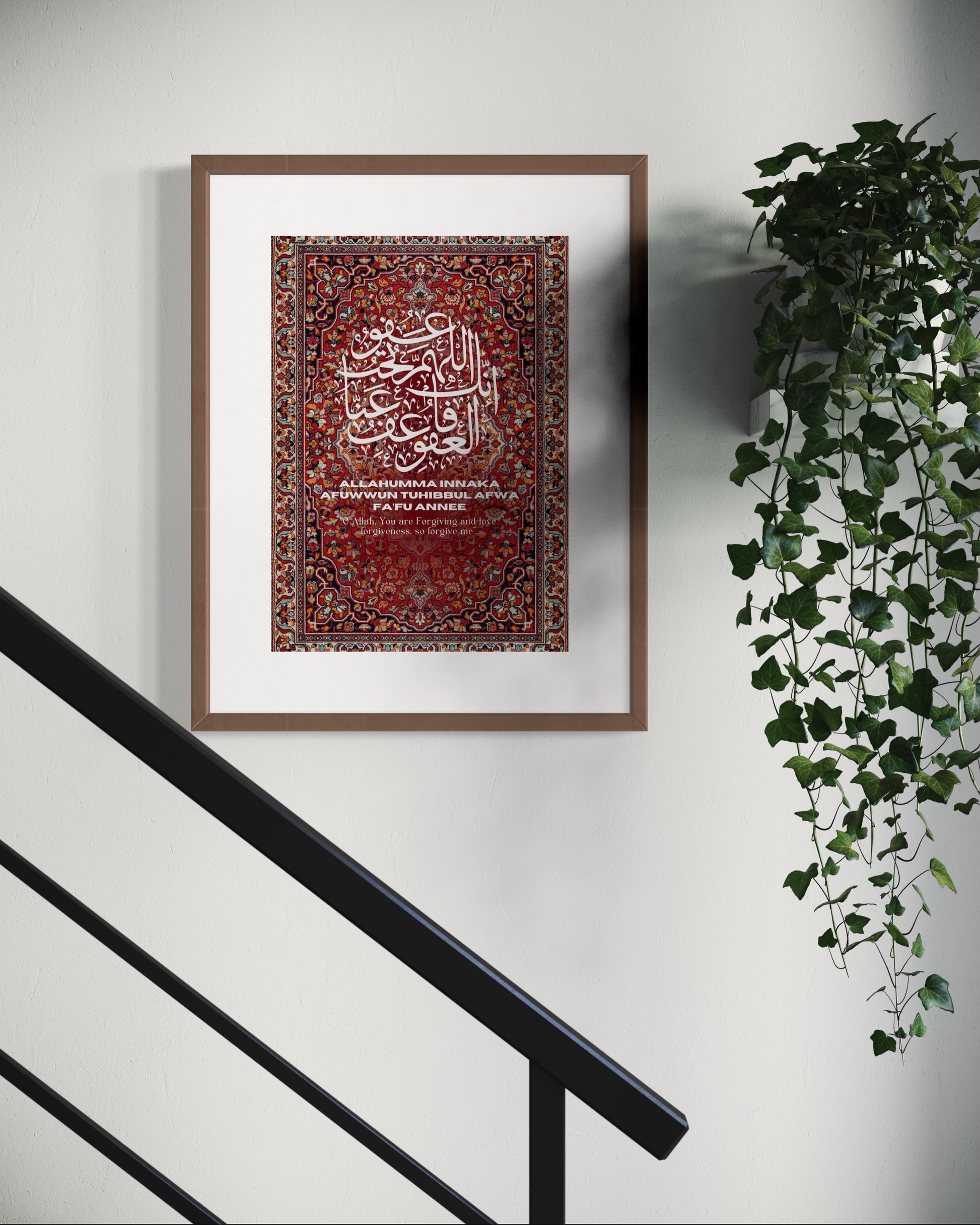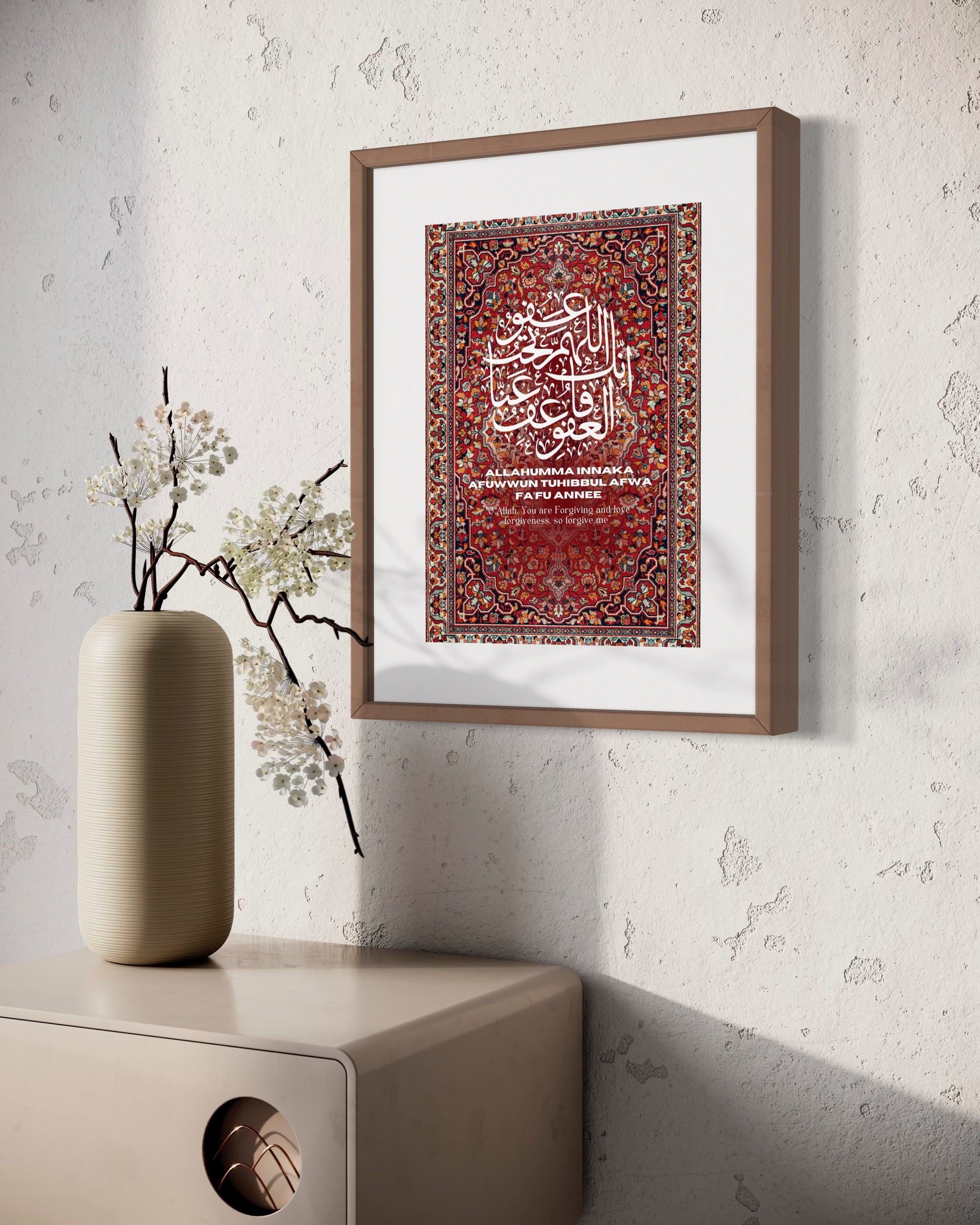 Entdecken Sie die Schönheit der Spiritualität mit unserem einzigartigen Poster, das das Bittgebet "Allahumma innaka afuwwun tuhibbul afwa fa’fu annee" in atemberaubender arabischer Kalligraphie präsentiert.