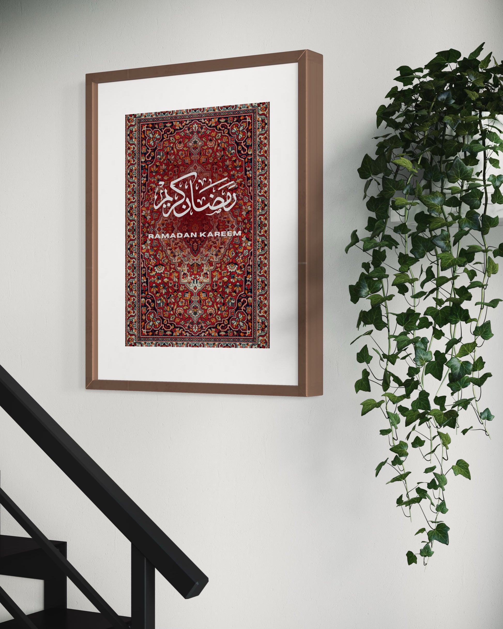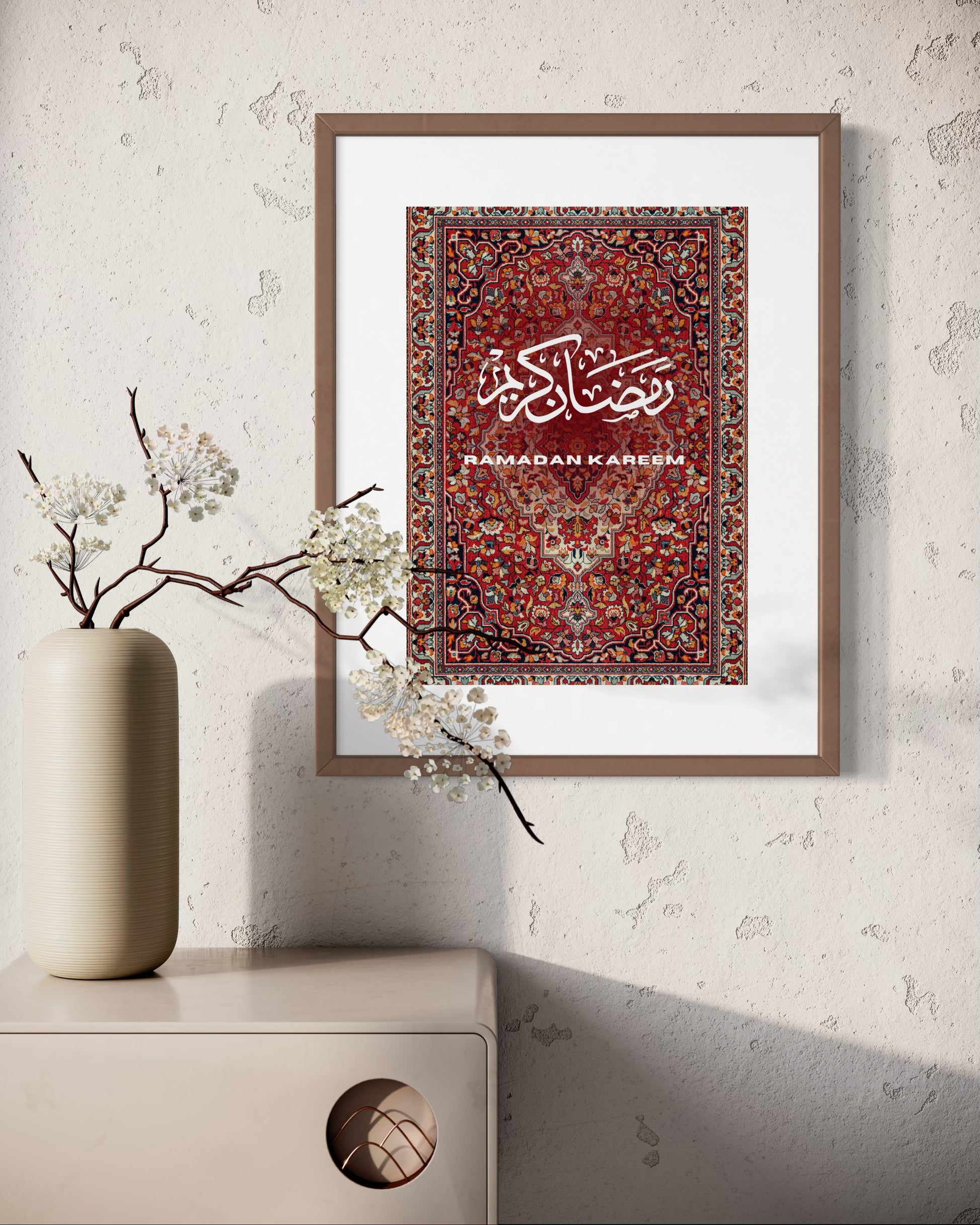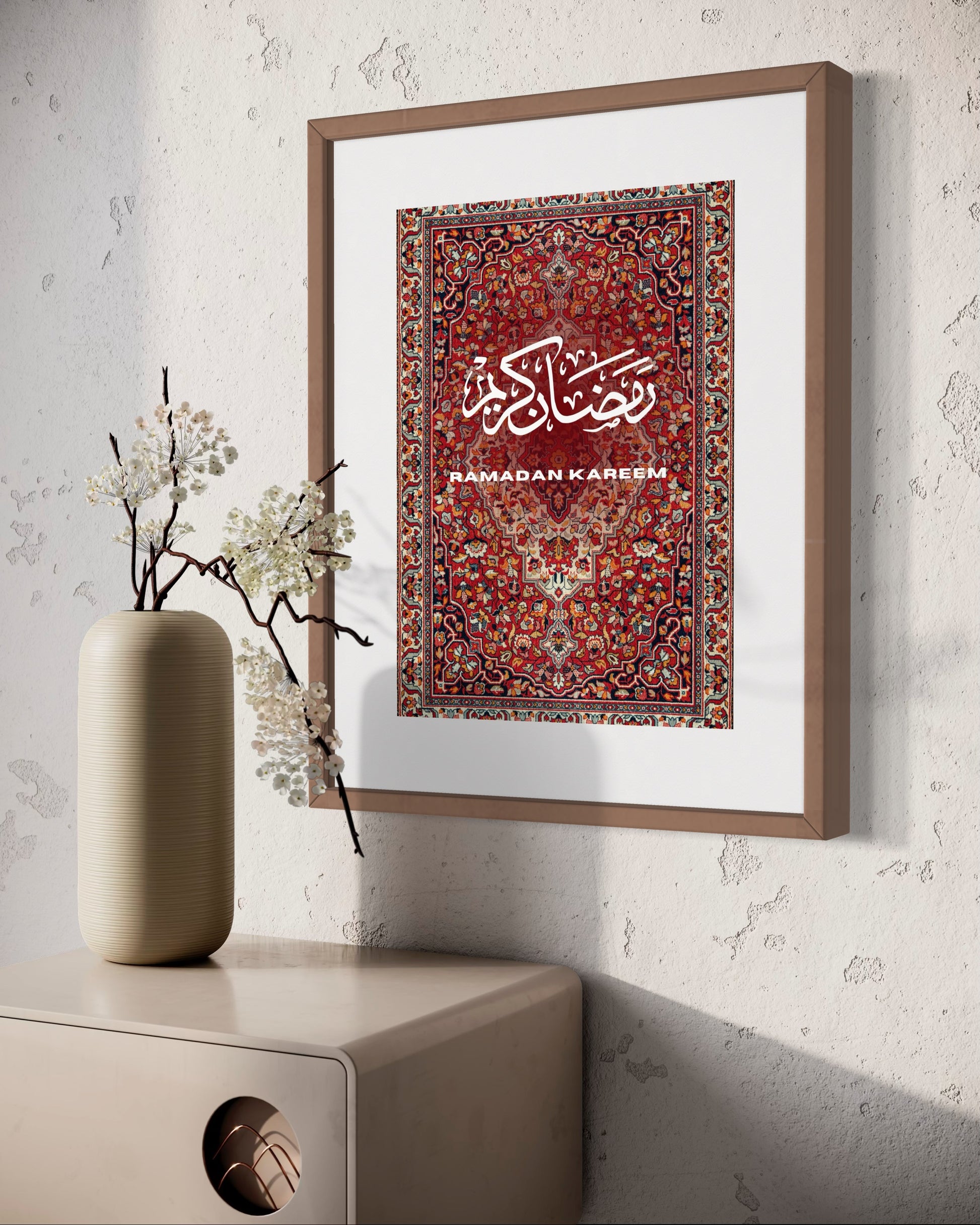Bringe die Schönheit und Tiefe des heiligen Monats Ramadan in dein Zuhause mit diesem kunstvoll gestalteten Poster. Inspiriert von traditionellen orientalischen Teppichmustern, vereint es die zeitlose Eleganz arabischer Kalligraphie mit einem warmen, detailreichen Design.